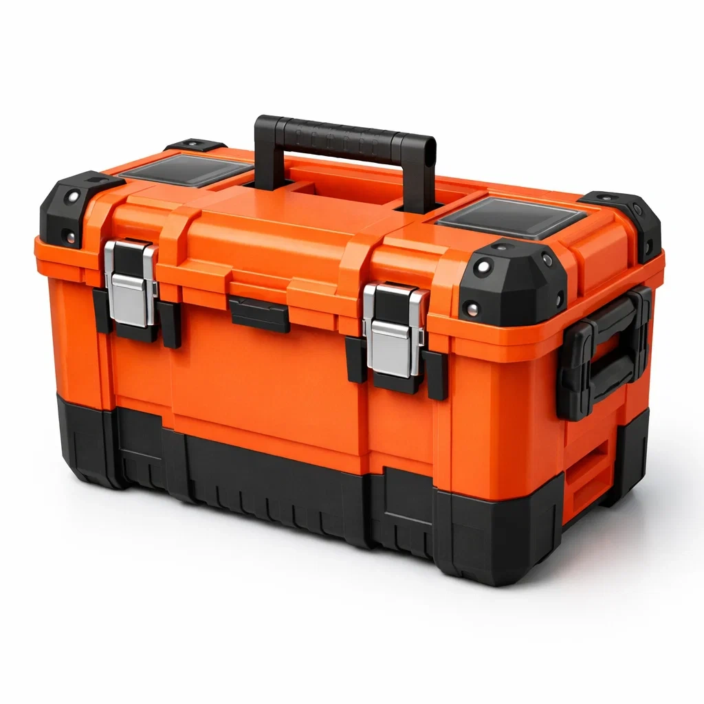 Boîte à outils en plastique orange avec fermetures métalliques