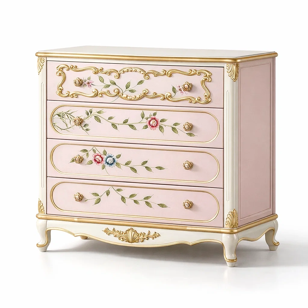Commode en bois massif rose avec motifs floraux dorés